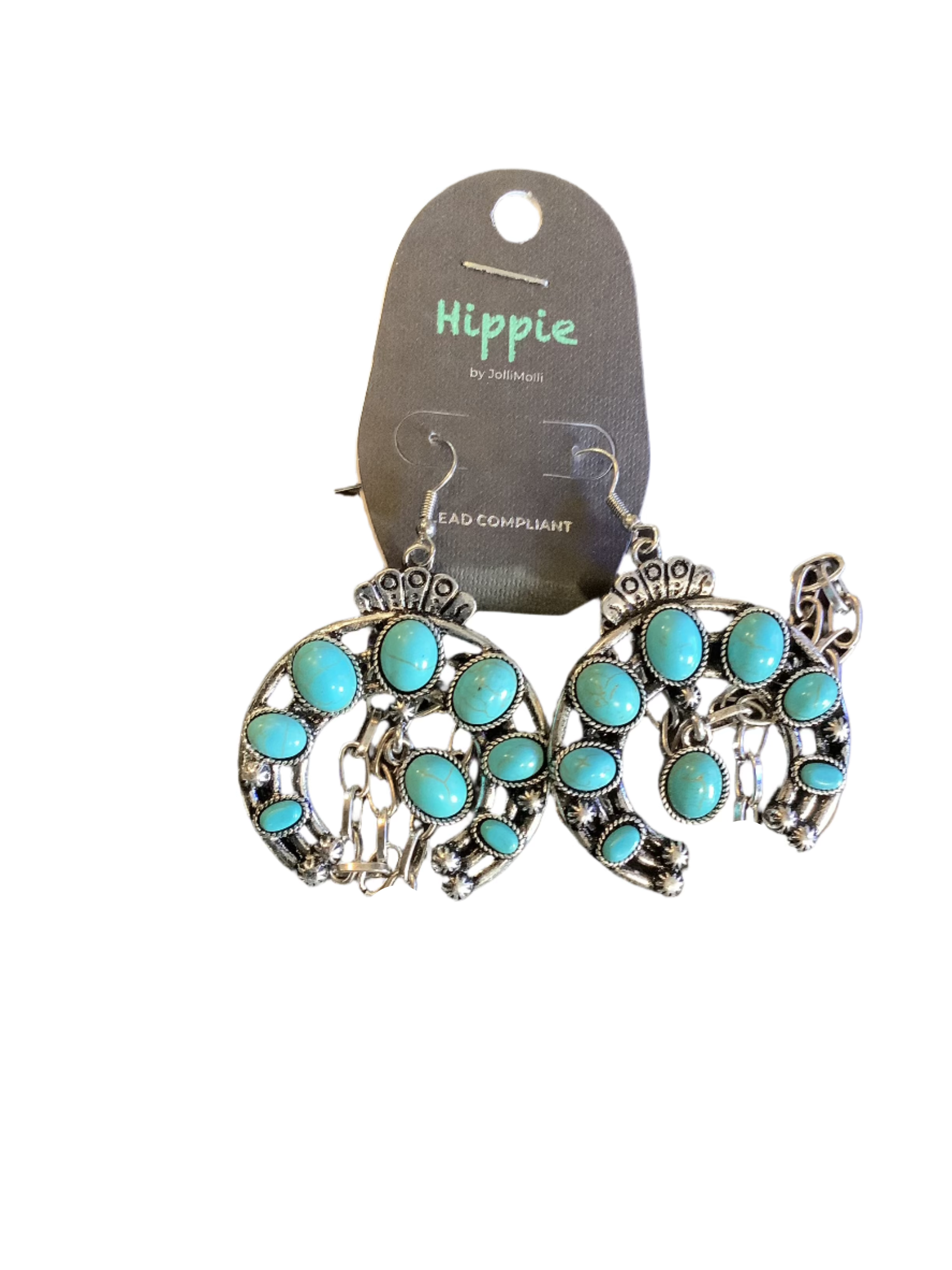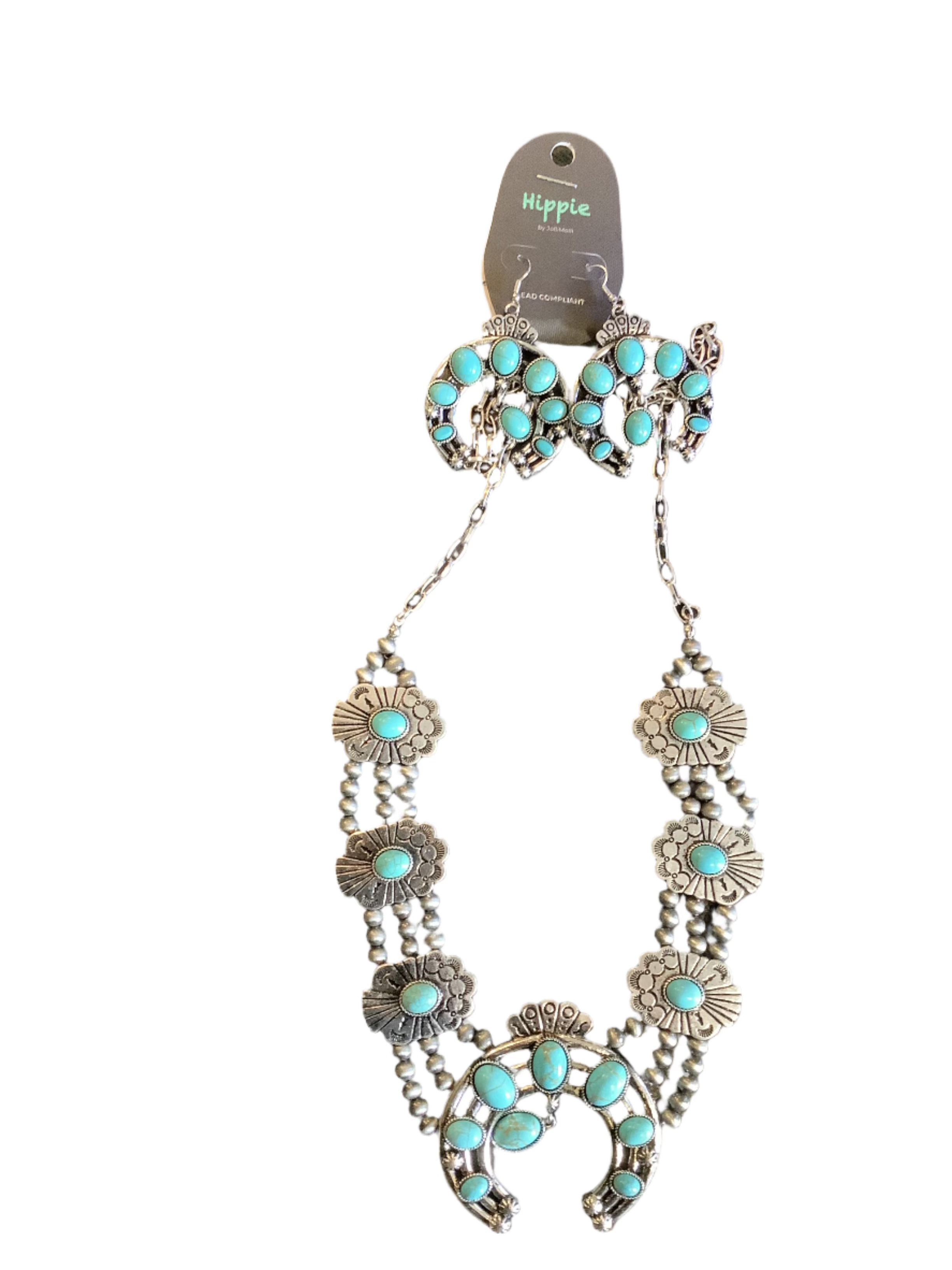 Make a bold Southwestern statement with this Turquoise Squash Blossom Necklace & Earring Set from the Hippie Collection! Featuring traditional squash blossom conchos, a dramatic crescent-shaped Naja pendant, and vibrant faux turquoise stones throughout, this set captures the essence of Western heritage with a modern flair.