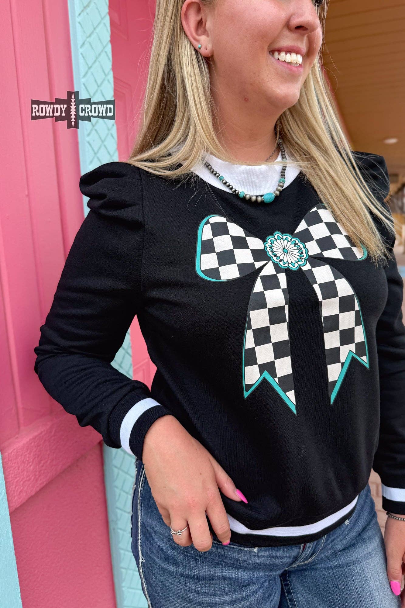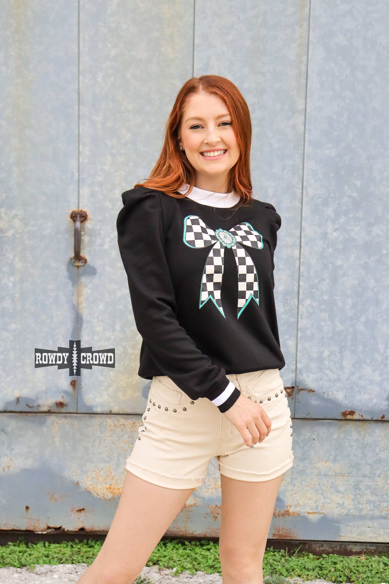 Cute, bold, and a little bit retro—the Buffalo Bow Top is serving attitude! Featuring a big checkered bow graphic front and center, contrast trim, and playful puff sleeves, it’s your go-to for comfy with a statement. Pair it with jeans, boots, or a skirt and own your look from cozy days to cool nights. * size Western Wholesale Clothing and Accessories.